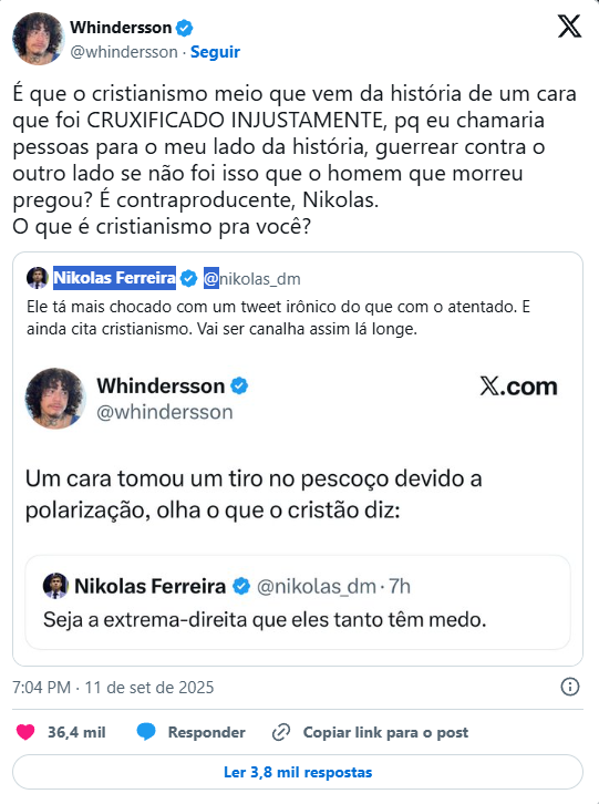 Segundo ele, usar a fé cristã como justificativa para discursos de divisão política não condiz com os princípios da própria religião. Whindersson foi além: destacou que momentos de tragédia deveriam unir as pessoas, não transformá-las em munição para discursos ideológicos.